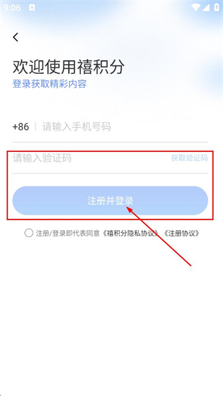 3、在填写收到的验证码后,点击注册并登录完成账号注册与登录。