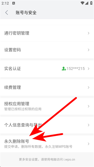 3、在该界面,需要点击永久删除账号,进入账号注销说明的页面。