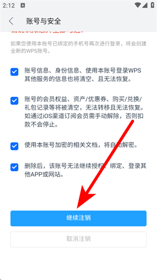 4、在页面确认相关提示后点击继续注销,按照后续提示完成账号注销操作。