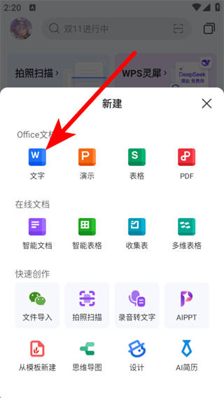 2、在新增的列表中,我们需要点击文字,进入文字文档创建页面。