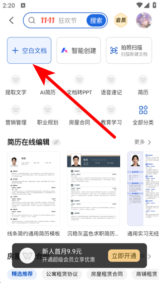 3、在文字文档创建页面,点击空白文档,即可完成创建文档的操作。