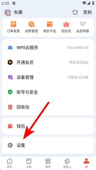 1、打开WPS Office,点击底部我进入个人页面,找到设置选项点击。