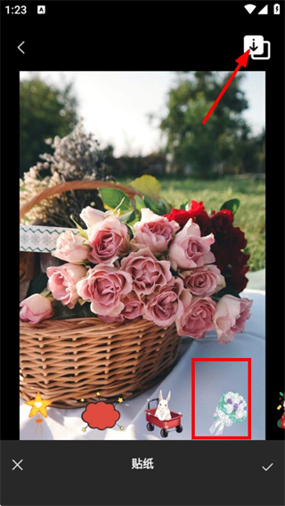 4、在贴纸界面,选择目标贴纸即可添加到图片中,点击下载即可保存图片。