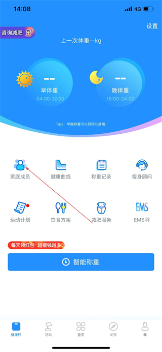 1、打开多锐APP,在健康秤页面点击家庭成员,进入家庭成员页面。