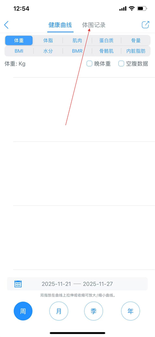 3、在健康曲线页面点击体围记录选项,切换到体围记录页面。