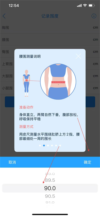 5、在记录围度页面点击腰围选项,弹出腰围测量说明及数值选择界面。