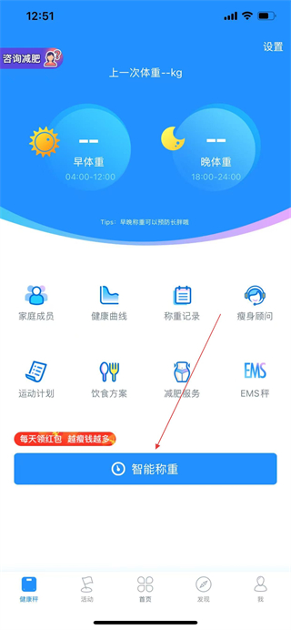 1、在多锐App首页点击底部的健康秤选项,进入健康秤页面。