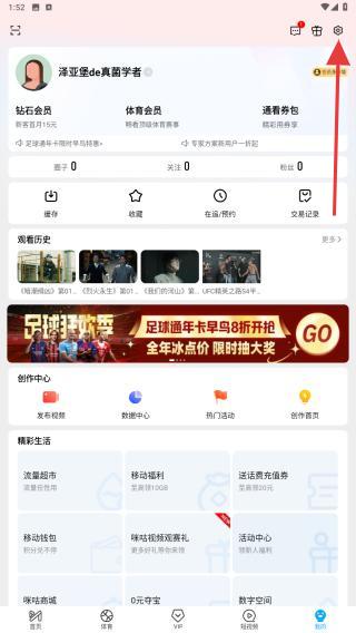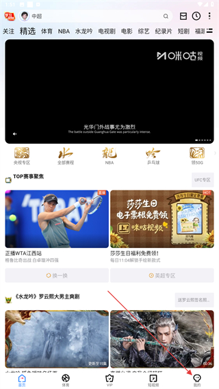 1、打开咪咕视频APP,在首页内点击右下角我的图标。