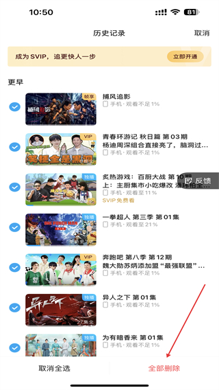 4、勾选要删除的视频内容后,点击右下角删除按钮。