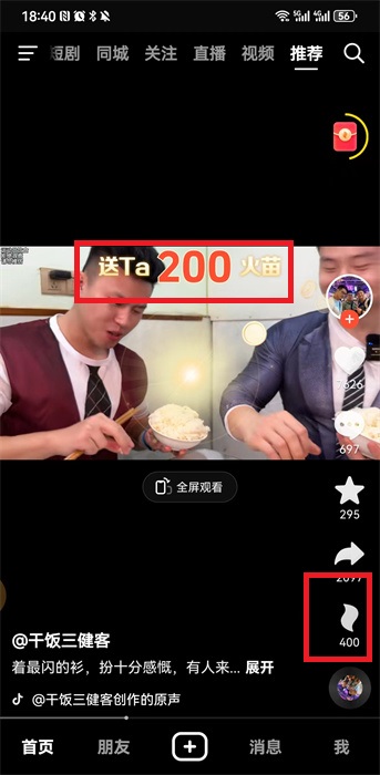 抖音火山版怎么赠送火苗