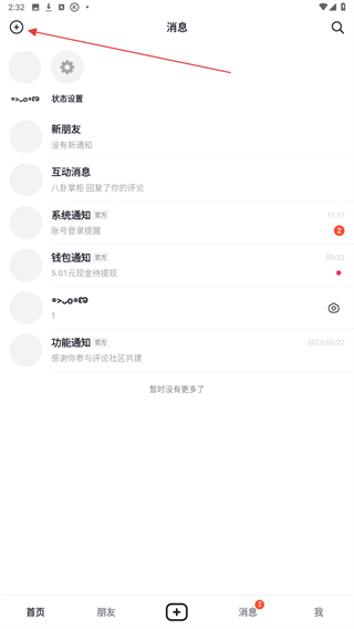 2、进入消息的页面内,点击左上角+的功能按钮。