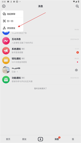 3、在弹出的菜单栏中,找到并点击添加朋友的按钮。