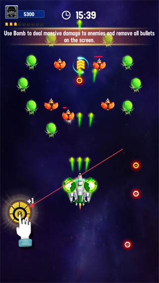 3、按提示点击炸弹按钮,清除全屏敌人与弹幕,快速提升得分。