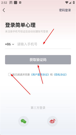 3、在登录页面输入手机号,勾选用户协议后点击获取验证码,获取对应的短信验证码。