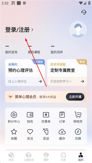 2、在个人中心页面点击登录/注册选项,进入登录简单心理页面。