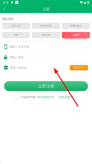 4、在页面先选择对应的角色,输入手机号码、设置密码、获取并填写验证码,勾选协议后点击立即注册即可。