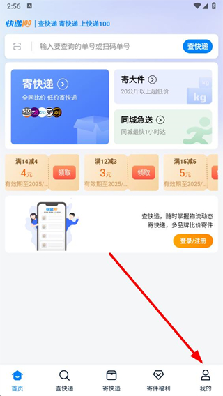 1、在快递100首页,点击右下角我的,进入个人页面。