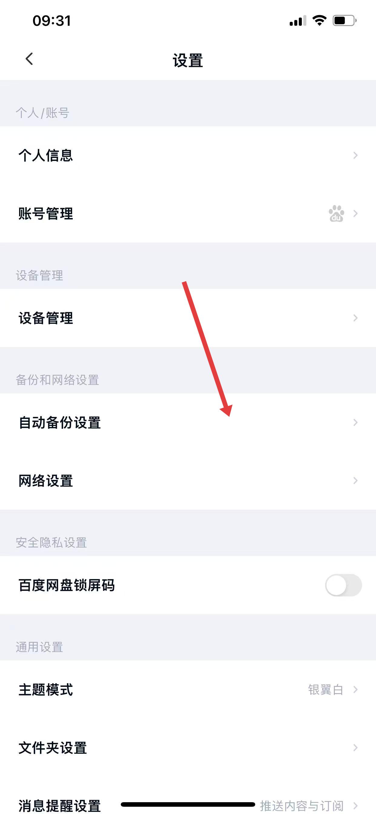 2、进入设置界面,接着在设置界面里,点击自动备份设置。