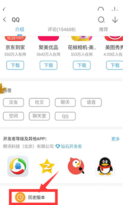 2、随后,点击软件进入到详情页,并向下滑动,找到最下方【历史版本】,如下图所示;