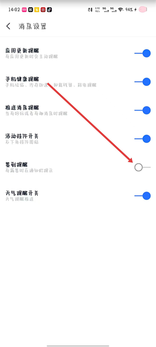 4、找到签到提醒对应的开关,点击开启开关即可。
