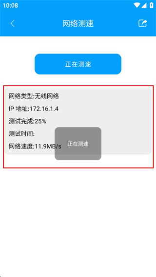 4、等待测速完成,查看显示的网络类型、IP地址、测试完成度及网络速度等信息。
