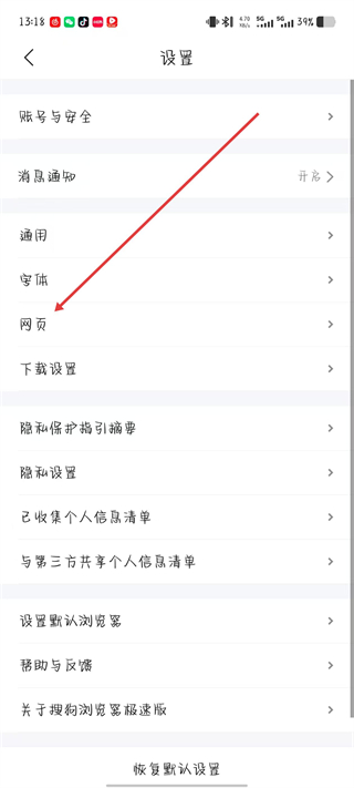 3、在设置页面,找到列表中的点击网页。