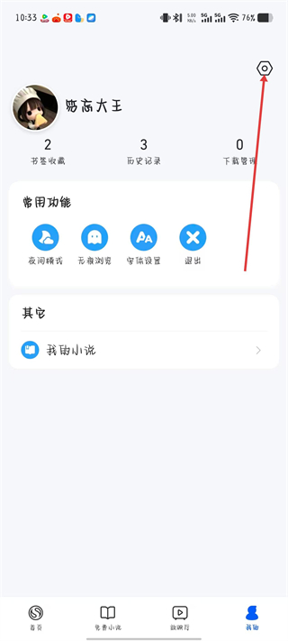 2、在个人功能页面右上角,找到设置图标并点击,进入浏览器的设置。