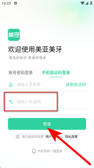 1、打开美亚美牙客户端,在弹窗中点击同意,进入登录页面。