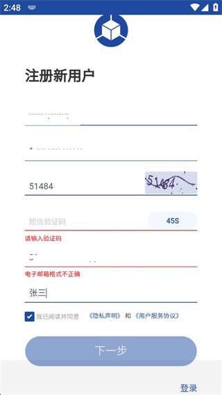 3、填写短信验证码、正确格式的邮箱及选填昵称,勾选协议后点击“下一步”推进注册。