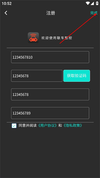 3、勾选“同意并阅读用户协议和隐私政策”选项,找到页面右上角的“完成”按钮并点击。