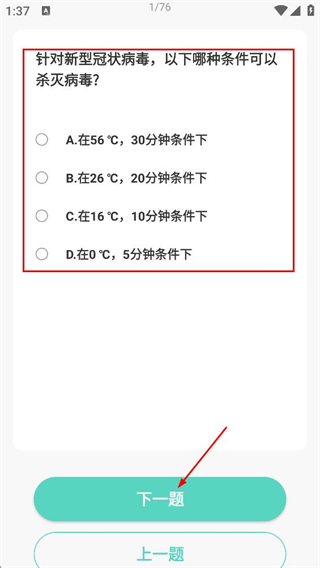 4、在题目页面,选择题目选项后,点击下一题,继续作答后续题目。