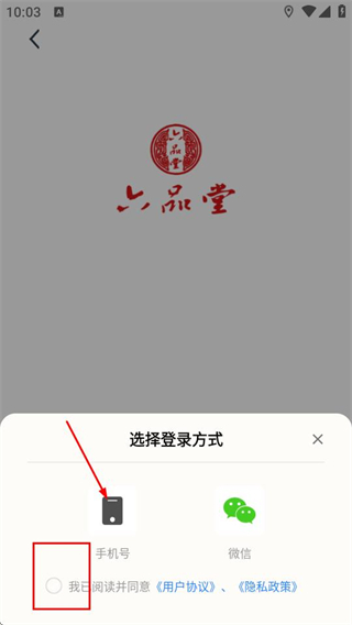 3、在登录方式页面,勾选协议后选择手机号登录,进入手机号填写页面。