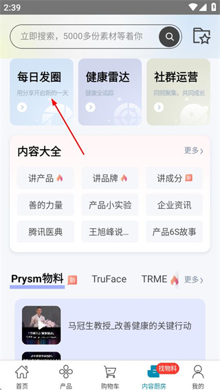 2、在内容厨房页面,点击每日发圈选项,进入每日发圈详情页面。