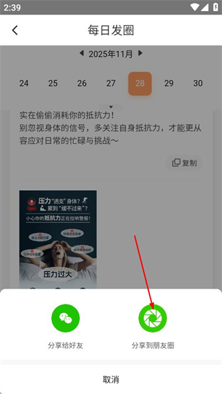 3、在每日发圈页面,点击分享按钮,弹出分享渠道选择菜单。