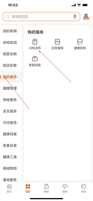 2、在服务页面的购药服务板块中,点击闪电送药选项,进入闪电送药页面。
