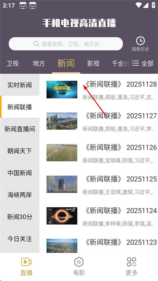 1、在手机电视高清直播首页,找到往期新闻联播的入口并点击。