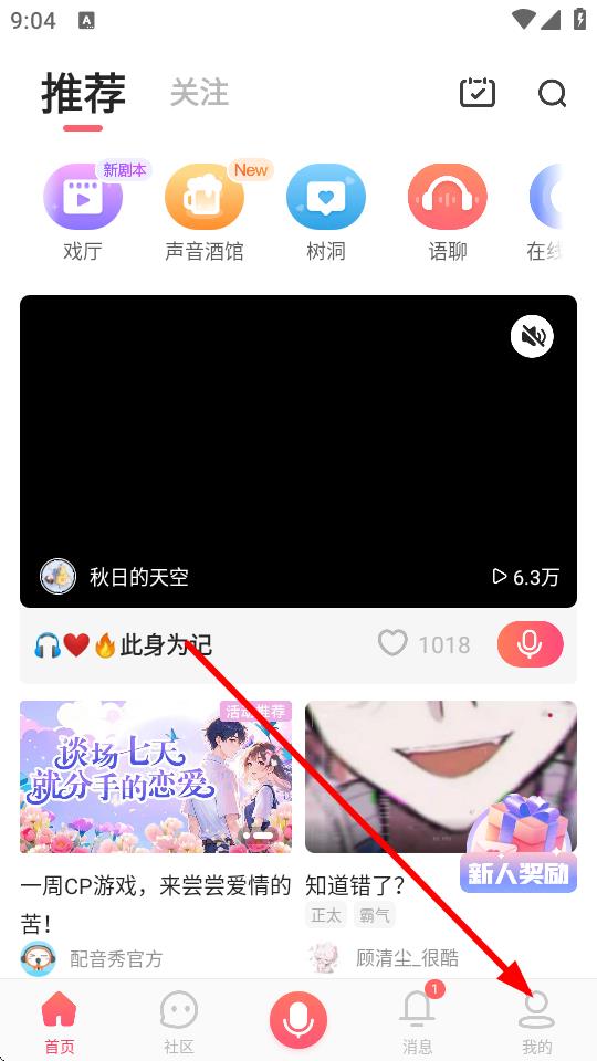 1、在配音秀首页,点击右下角我的选项,进入个人中心界面。