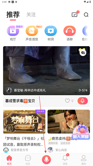 1、启动配音秀的应用,进入首页点击下方录音的按钮。