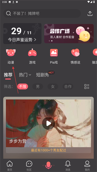 2、进入配音的页面内,选择并点击动漫的按钮。