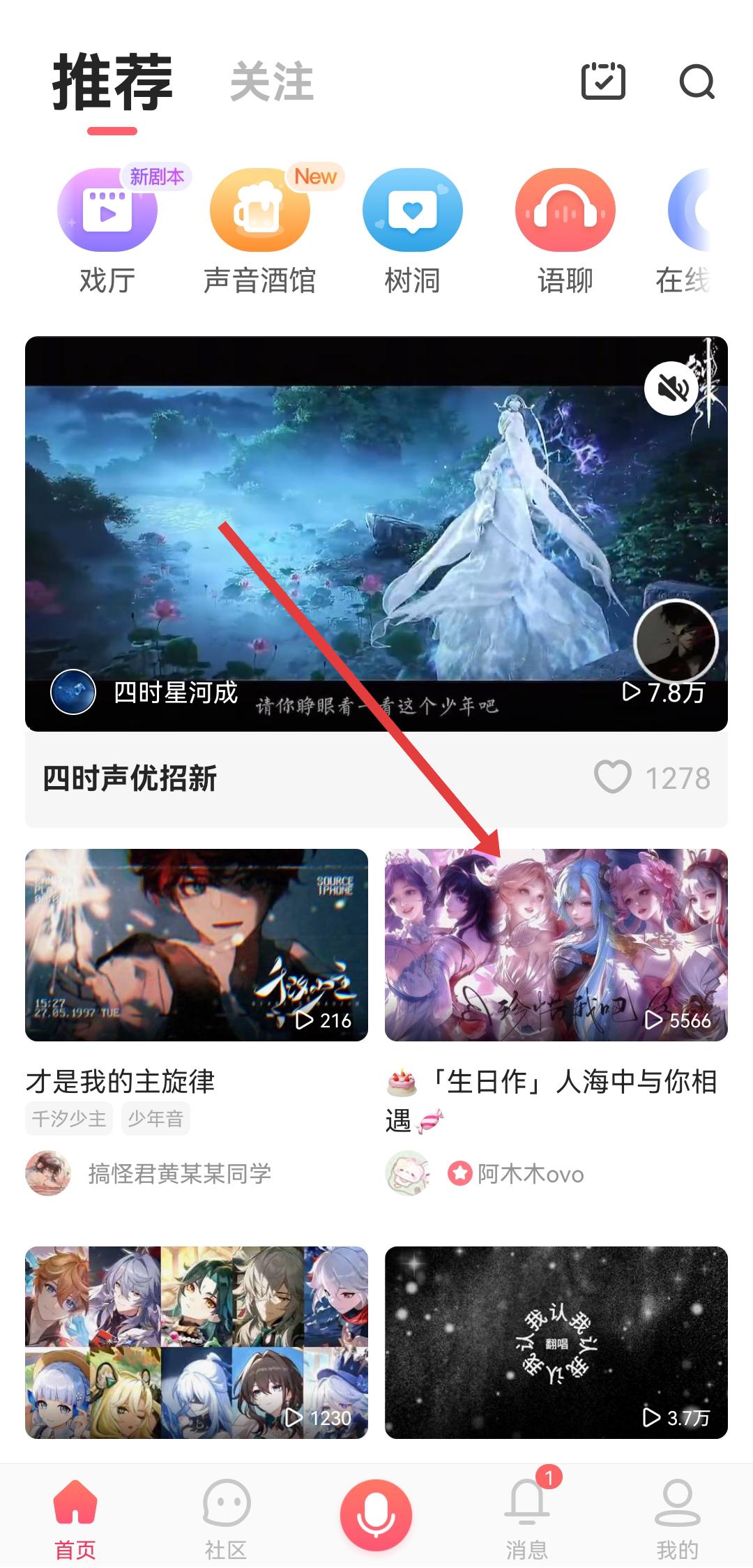 1、打开配音秀APP,在首页推荐中找到想要配音的作品,点击进入作品的详情页面。