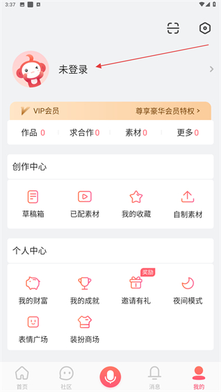 2、进入个人主页内,点击上方未登录的区域。