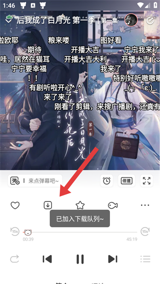 2、在音频播放的界面,点击下载的图标,会弹出已加入下载队列的提示,音频开始下载。