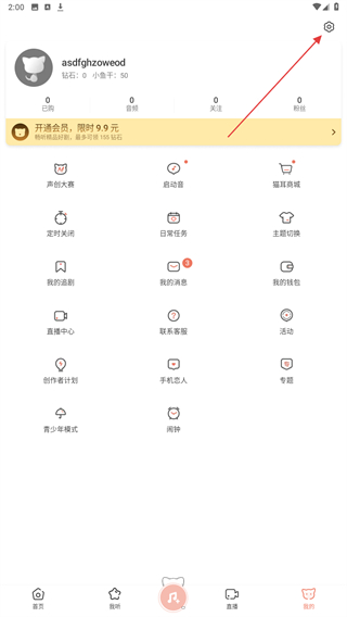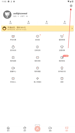 2、进入我的页面内,点击右上角设置的功能按钮。