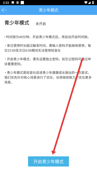 2、在进入到青少年模式页面后,可以点击下方开启青少年模式按钮进行操作。
