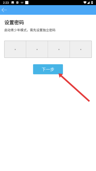 3、跳转到设置密码页面,要开启青少年模式需要设置密码后点击下一步。
