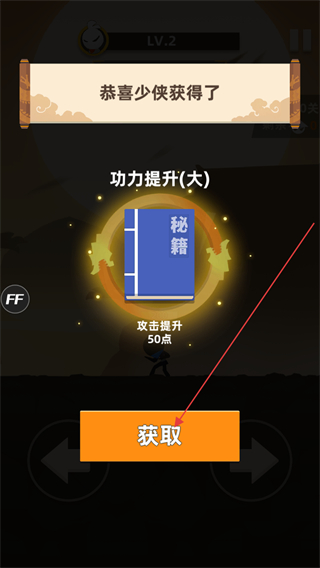 4、点击获取按钮,获得功力提升大秘籍,攻击提升50点。