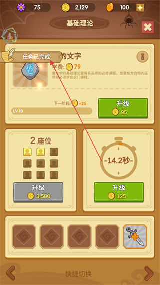 2、进入基础理论界面,点击巫师简史右侧的升级按钮,消耗金币提升课程等级。