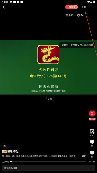 3、进入电影播放的界面内,点击右上下载按钮即可开始。
