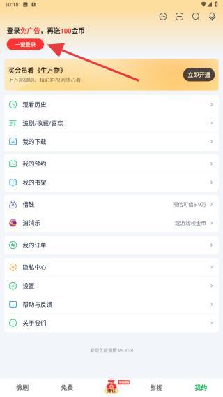 2、在我的页面顶部,找到并点击下方的一键登录的按钮,弹出登录选项弹窗。