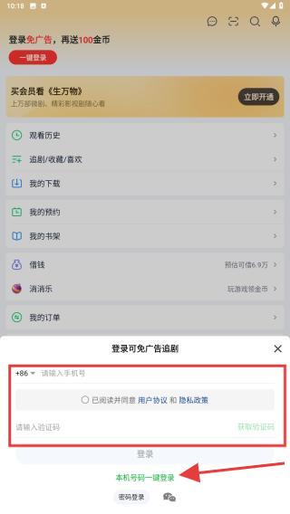 3、弹窗展开后,提供两种手机号登录路径:本机号码一键登录按钮、手机号输入框中,获取验证码,任需选择。
